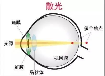 散光(乱视)与角膜的弧度有关,是眼睛一种屈光异常的状况。由于眼球前面(角膜部分)呈椭圆形,光线经过眼球屈折(折射)后,水平光线和垂直光线在视网膜上形成多个焦点(正常的焦点只有一个)而产生双重影像。